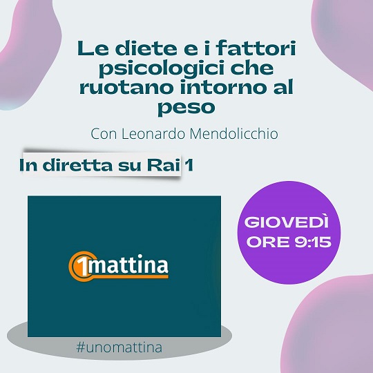 Il Dott. Leonardo Mendolicchio, psichiatra, uno dei professionisti dell'equipe di Auxologico, giovedì 26 gennaio 2023 sarà ospite della trasmissione UnoMattina. Appuntamento alle ore 9:15 sugli schermi di Rai Uno. Si parlerà di dieta e psicologia e in particolare delle "diete e i fattori psicologici che ruotano intorno al peso".